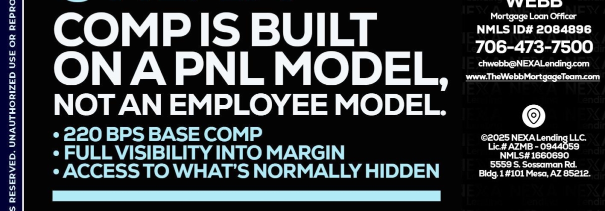 2 OF 3 - Christopher Webb -Mortgage Loan OfficerHi, my name is Christopher Webb. I’m a Loan Officer with NEXA Lending LLC., offering personalized mortgage solutions, fast customized quotes, great rates and service with integrity.