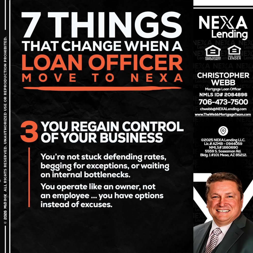 7 things (3) - Christopher Webb -Mortgage Loan OfficerHi, my name is Christopher Webb. I’m a Loan Officer with NEXA Lending LLC., offering personalized mortgage solutions, fast customized quotes, great rates and service with integrity.