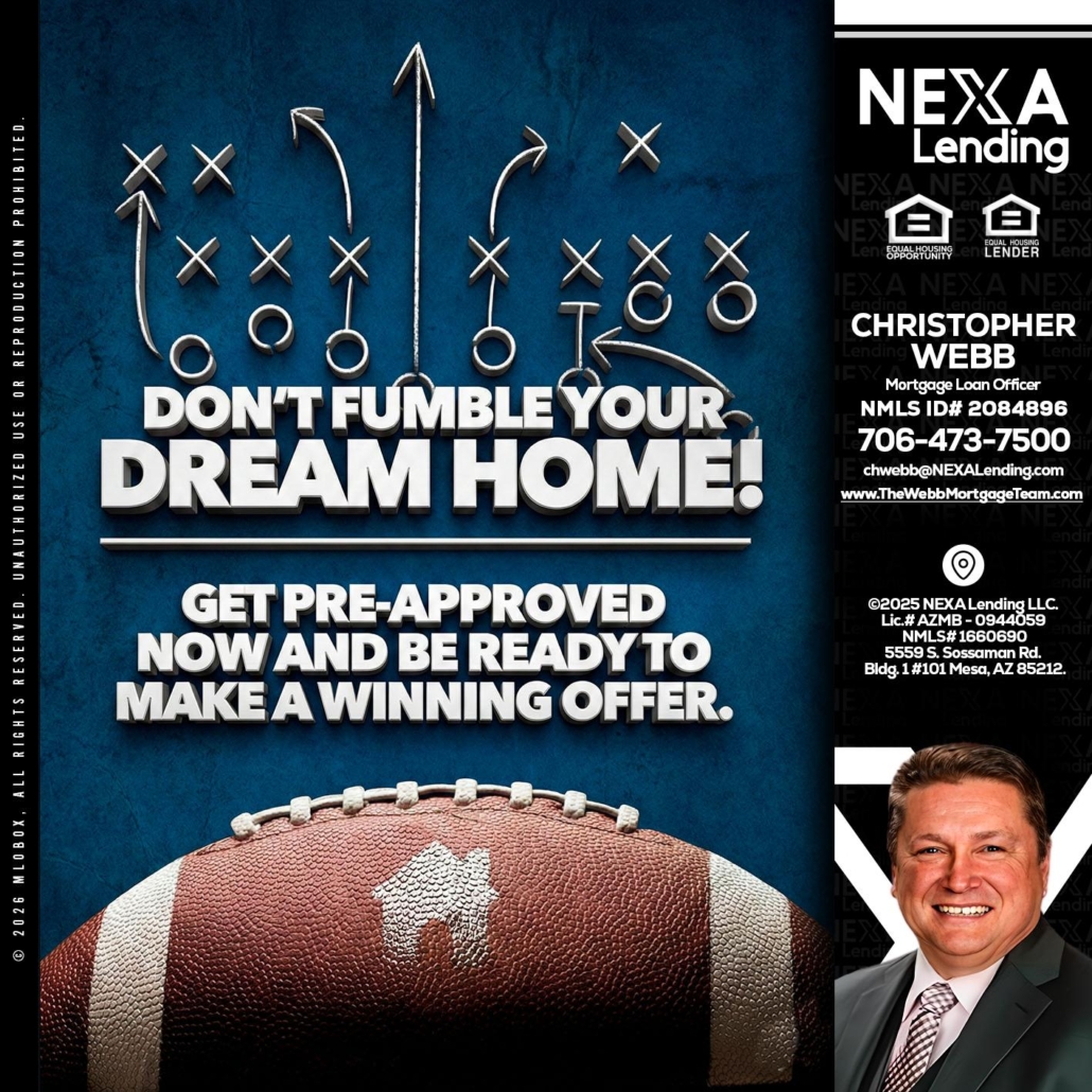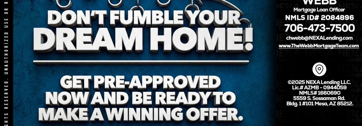 dont fumble - Christopher Webb -Mortgage Loan OfficerHi, my name is Christopher Webb. I’m a Loan Officer with NEXA Lending LLC., offering personalized mortgage solutions, fast customized quotes, great rates and service with integrity.