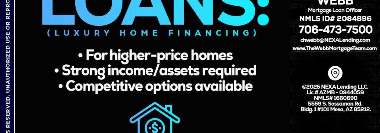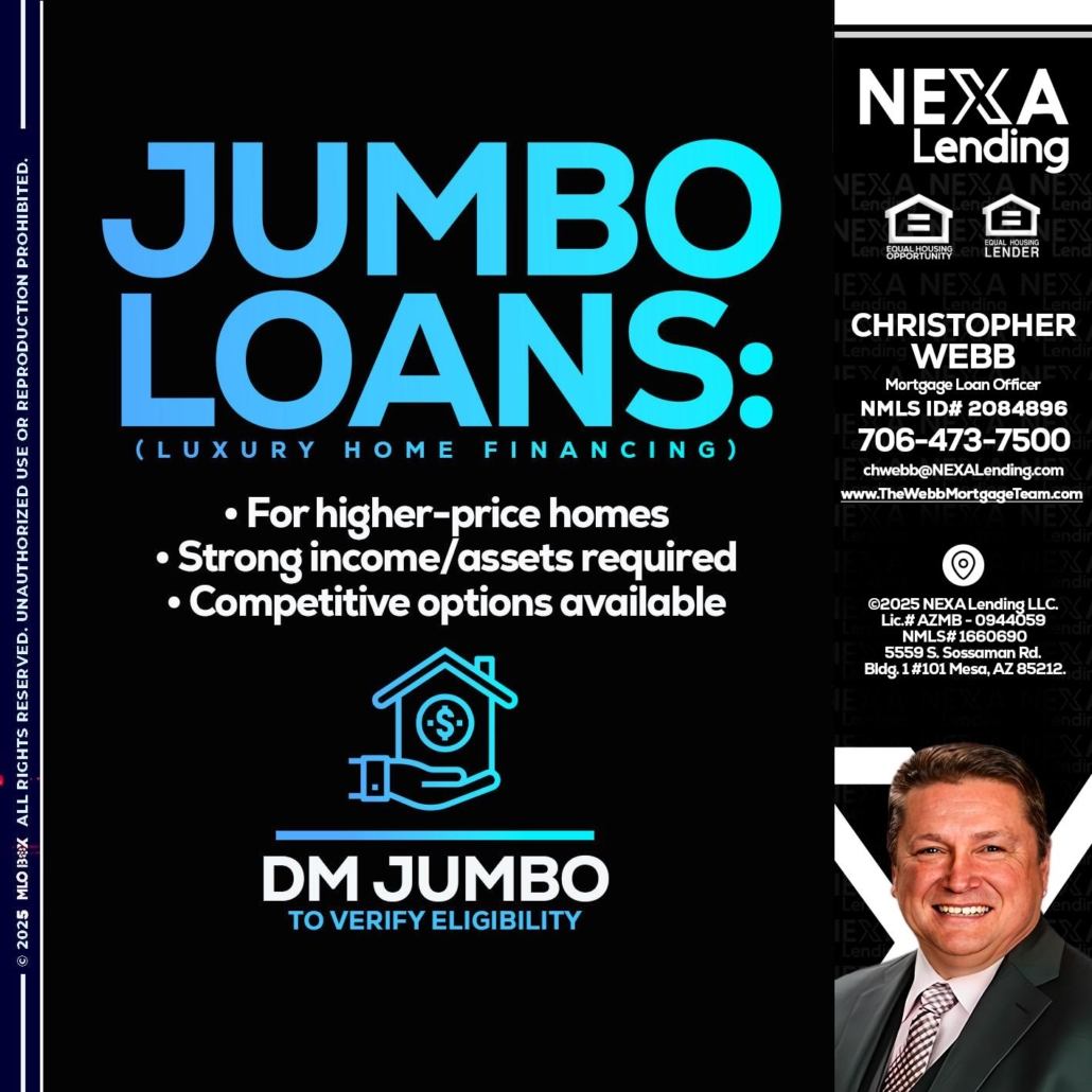 JUMBO LOANS - Christopher Webb -Mortgage Loan OfficerHi, my name is Christopher Webb. I’m a Loan Officer with NEXA Lending LLC., offering personalized mortgage solutions, fast customized quotes, great rates and service with integrity.