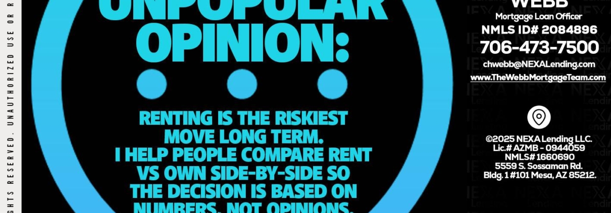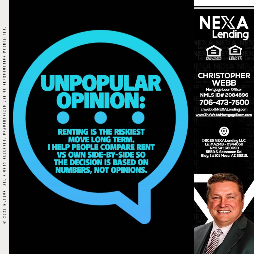 unpopular opinion - Christopher Webb -Mortgage Loan OfficerHi, my name is Christopher Webb. I’m a Loan Officer with NEXA Lending LLC., offering personalized mortgage solutions, fast customized quotes, great rates and service with integrity.